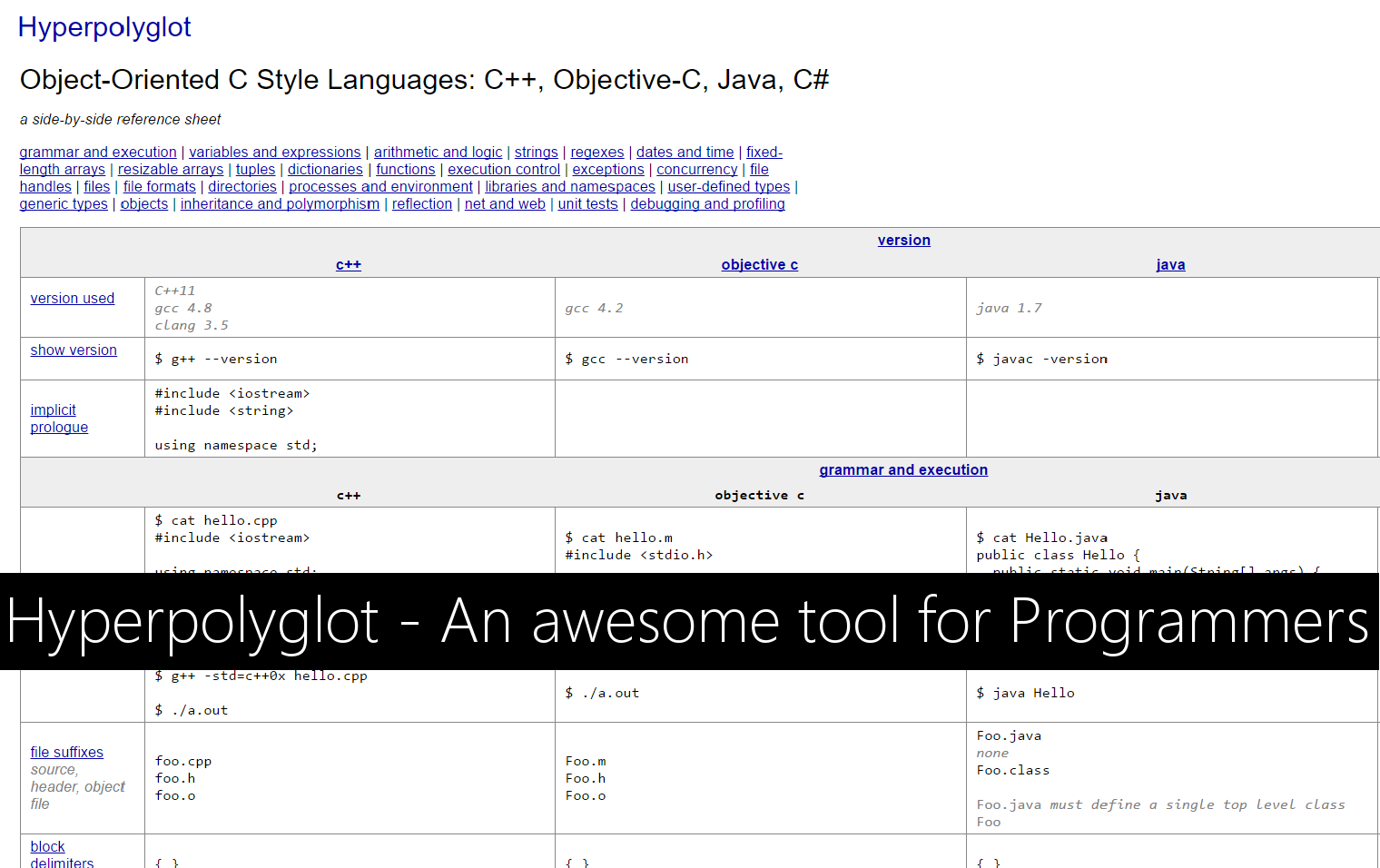In Brief: Hyperpolyglot is a reference sheet which provides side-by-side references among various languages and tools.This online sheet is a vast collection of comparision of languages and tools that any programmer will find useful.If you are a programmer,then give it a shot today and bookmark it for future use.