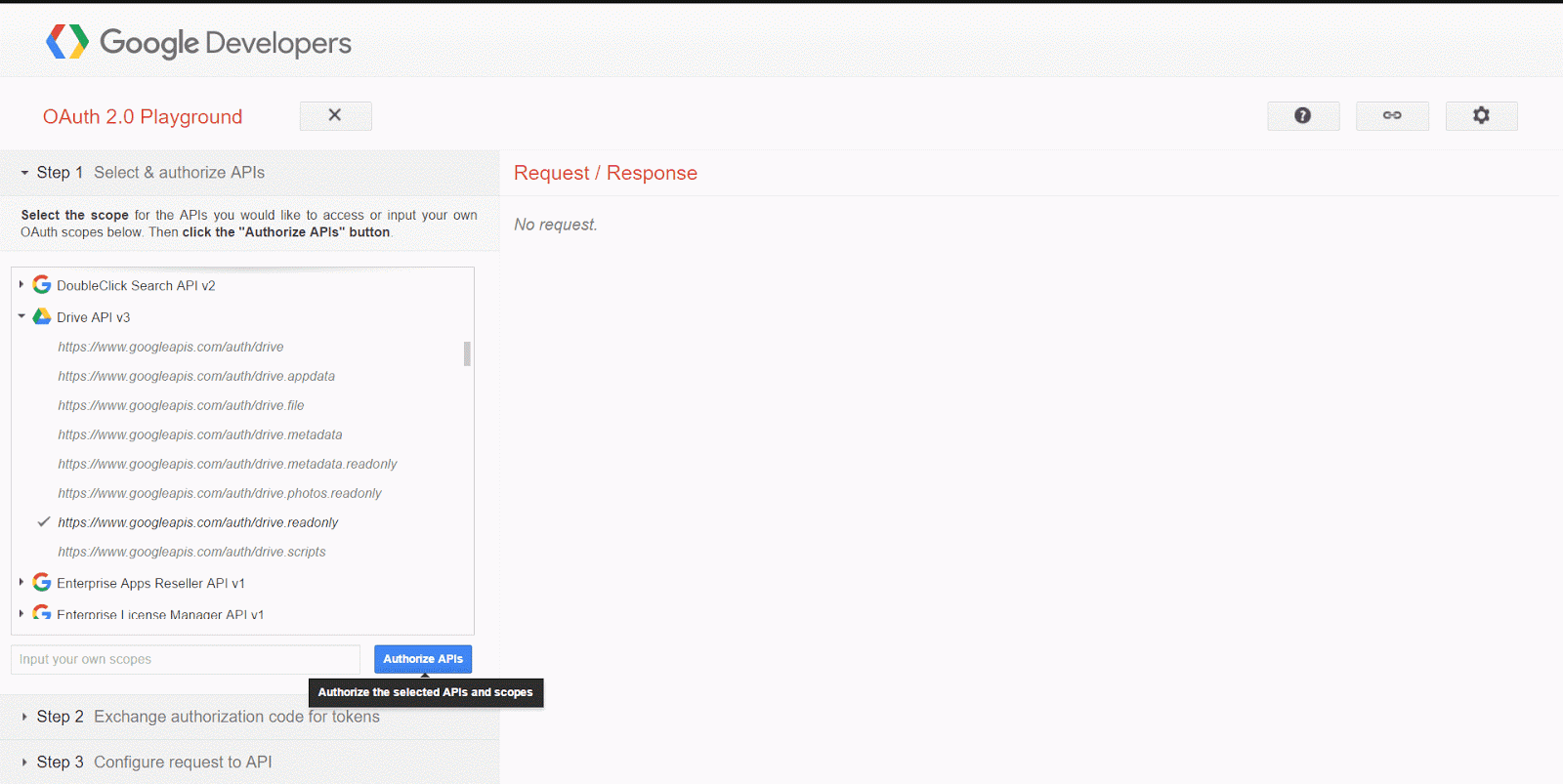 2. In the “Select the Scope” box, scroll down, expand “Drive API v3”, and select “https://www.googleapis.com/auth/drive.readonly”